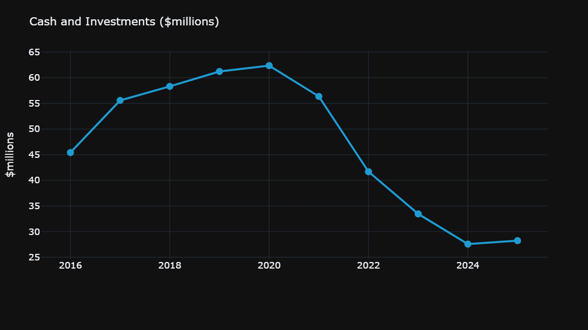 As you can see from the chart below, Hampshire’s cash and investments have continued to decline since 2020. It has a lower cash balance than it did during its 2019 crisis.
