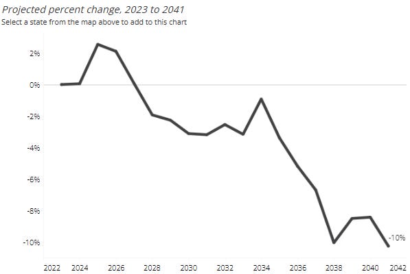 The Western Interstate Commission for Higher Education projects a ~10% decline in high school graduates by 2042 relative to 2022 levels.