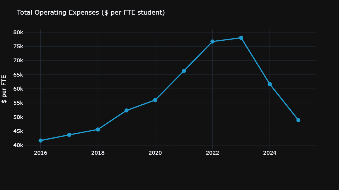 Higher education has a high fixed-cost structure. Faculty, facilities, and administration do not scale down easily with enrollment. When revenue declines, costs remain largely intact.