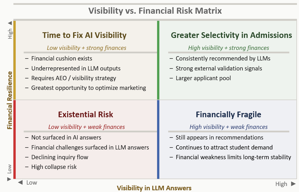 LLMs and AI search are changing how colleges are perceived by surfacing indications of financial difficulty, including solvency concerns.