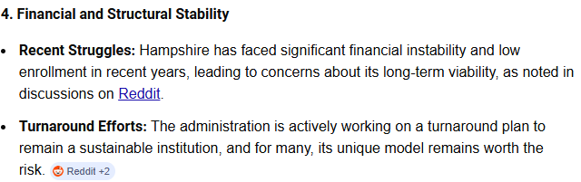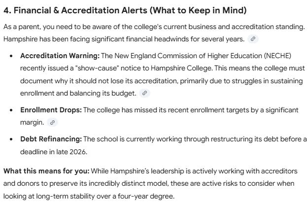 Hampshire College illustrates the risk — its financial challenges and going concern warnings are now surfaced directly in AI-generated answers. Will already challenged enrollments deteriorate with increased transparency?