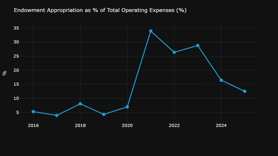 Note that its endowment draw as a percentage of operating expenses exceeded the typical industry norm of ~5%. This was not a sustainable path for them over the long-haul.