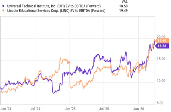 Vocational operators have seen the most pronounced re-rating. Both LINC and UTI have experienced sustained multiple expansion over the past 12–18 months, with forward EV/EBITDA multiples now at or near cycle highs. This reflects a combination of accelerating growth, improved execution, and investor preference for workforce-aligned education models.