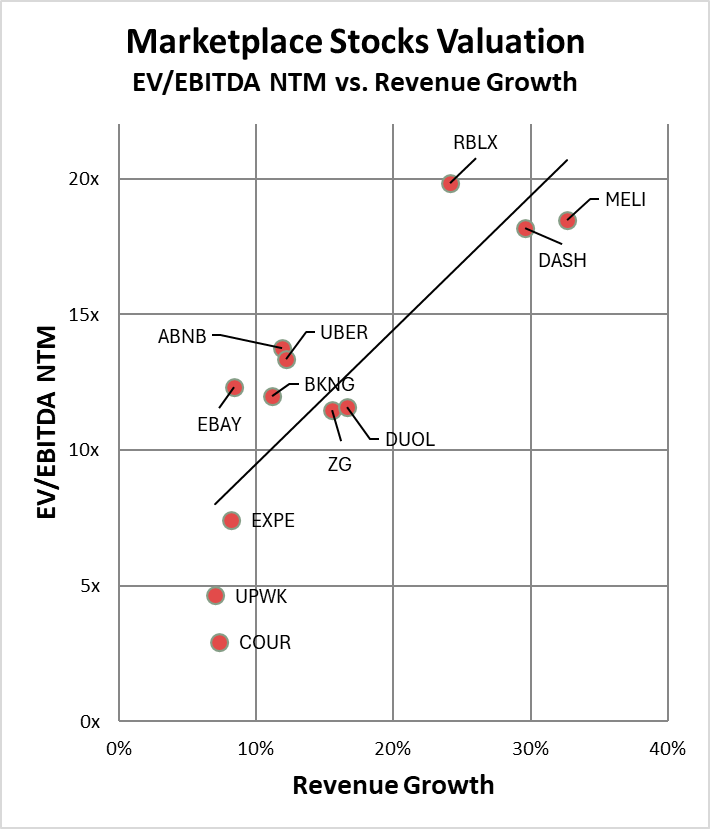 To evaluate Coursera’s valuation, I compare it against a group of consumer and marketplace businesses, including Roblox, DoorDash, Pinterest, HubSpot, Wix, Adobe, monday.com, Klaviyo, and Duolingo.