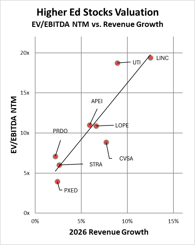 Despite being an orphaned stock, my sense is that investors for better or worse anchor the company within the broader peer group of publicly traded postsecondary education operators like Strategic Education, Perdoceo, Universal Technical Institute, and Lincoln Educational Services. Those operators are valued primarily through a relationship between revenue growth and EV/EBITDA multiples.