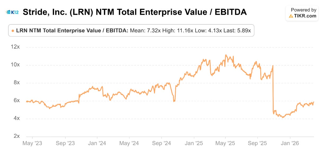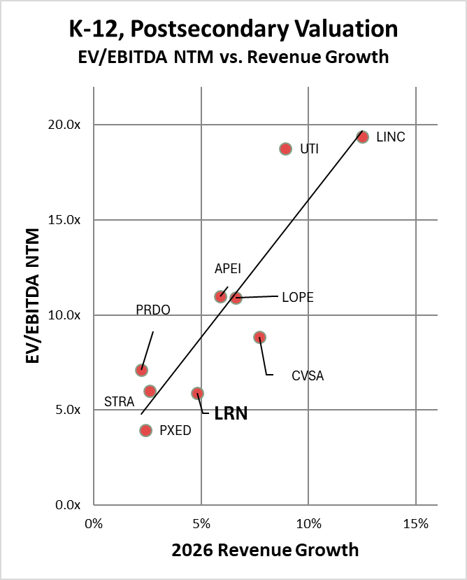 Although Stride (LRN) lacks a clean comp set, when anchored to postsecondary peers, it appears as undervalued with clear multiple expansion potential