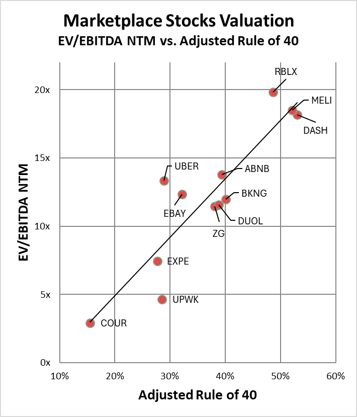 Unlike Coursera, Duolingo’s valuation aligns with the traditional relationship between EV/EBITDA and revenue growth. Not adjusted Rule of 40 like Coursera.