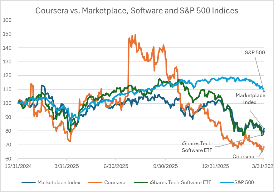 Since the start of 2025, Coursera’s stock has lagged my constructed marketplace index, the S&P 500, and software benchmarks such as the iShares Expanded Tech-Software ETF.