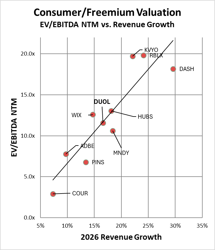 Within this peer set, Duolingo does not show up at the high end of either growth or valuation. Rather, it sits in the middle of the group, with a multiple that is broadly consistent with its current financial profile. If you take a look at the chart, it actually sits on the regression line. Meaning that at the current level on a relative basis the stock is neither a screaming buy nor a short.