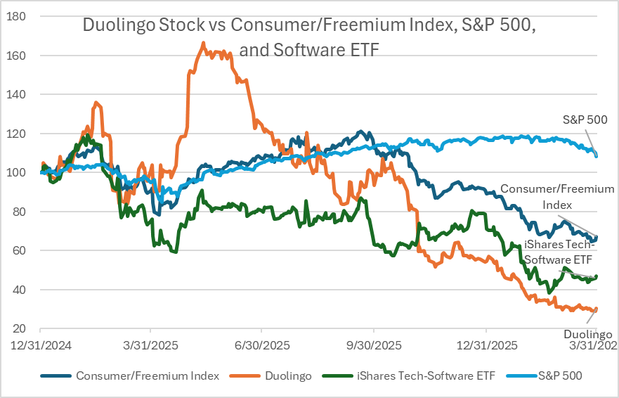 Like Coursera, Duolingo has underperformed relative to its peer group. Since the start of 2025, the stock has lagged a broader consumer/freemium index, the S&P 500, and software benchmarks such as the iShares Expanded Tech-Software ETF. The stock saw meaningful stock price appreciation in mid-2025, but has since given back those gains, reflecting both multiple compression and concerns regarding the durability of its business model in an AI world.