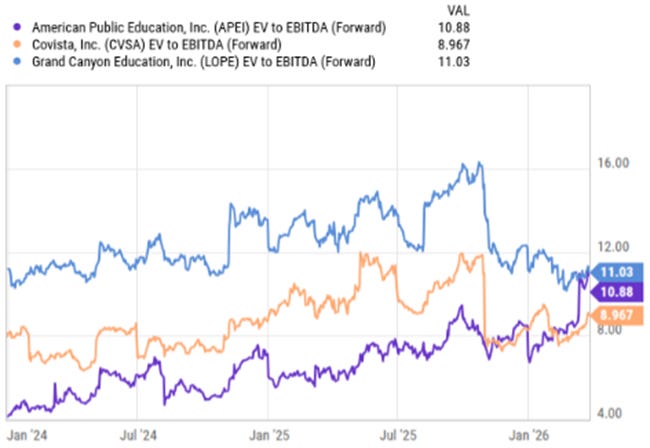In contrast, nursing and ground-campus institutions—including American Public Education (APEI), Grand Canyon Education (LOPE), and Covista (CVSA)—have exhibited more stable valuation trends. Multiples have generally moved within a narrower range, consistent with moderate but steady growth profiles and less volatility in underlying demand.