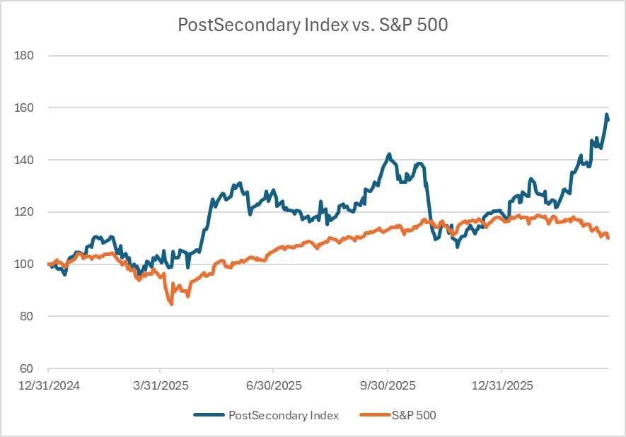 In Q1 2026, the postsecondary group materially outperformed the S&P 500, delivering high double-digit returns versus a roughly -7% decline in the broader market. This divergence suggests a sector-specific re-rating, rather than a macro-driven move.