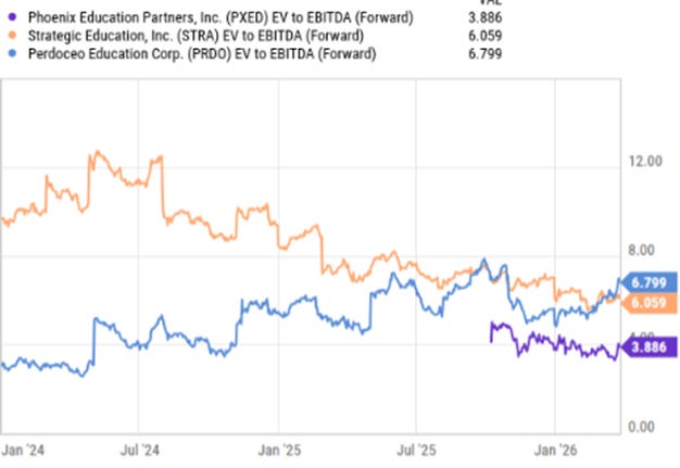 The most notable divergence is in online-focused operators. Strategic Education (STRA), Perdoceo (PRDO), and Phoenix Education Partners (PXED) have seen flat to declining multiples over the same period, with valuations remaining closer to cycle lows. These businesses have not benefited from the same multiple expansion, reflecting slower growth and increased skepticism around long-term positioning.